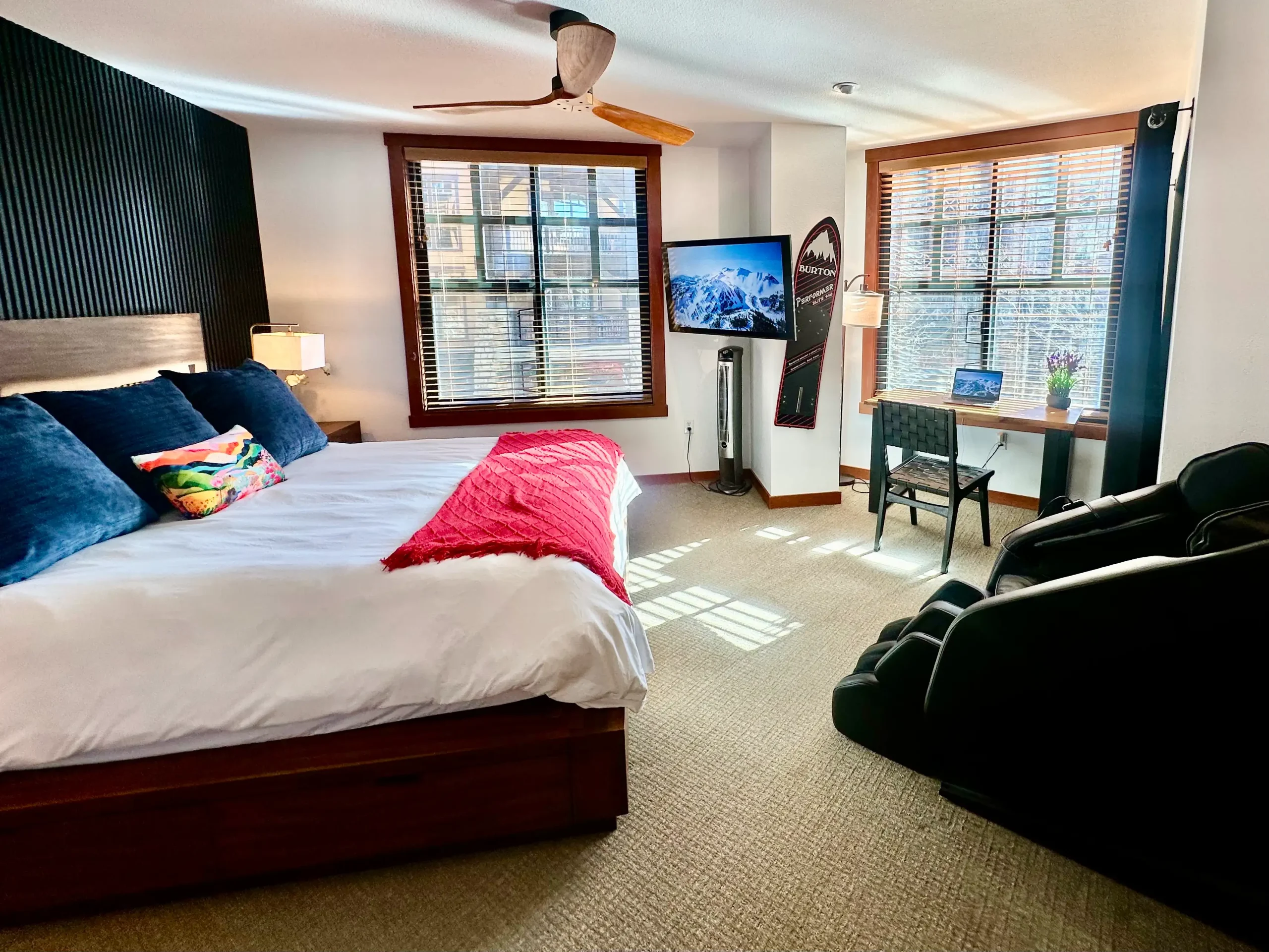 Master bedroom with king bed, massage chair, desk, Samsung 50" TV, custom art work.